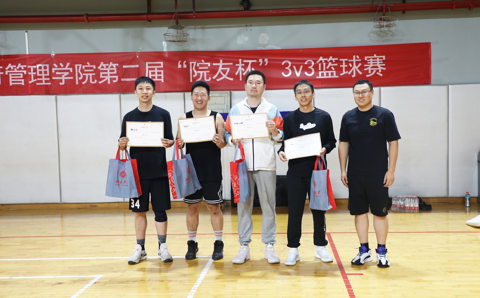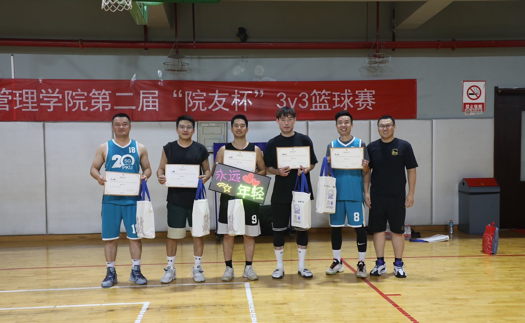 赛后,刘明乾老师为各个获奖队伍颁奖,第一名为“中老年模特队”,第二名为“空中作业队”,第三名为“阿达西队”,“放开抡队”获优秀团队奖,“单纯男队”获公平竞赛奖,“詹姆士小火车队”获积极拼搏奖,“HK 队”获体育风尚奖,“中老年模特队”连世洲被评为最佳球员,“空中作业队”赵威被评为最佳防守球员。